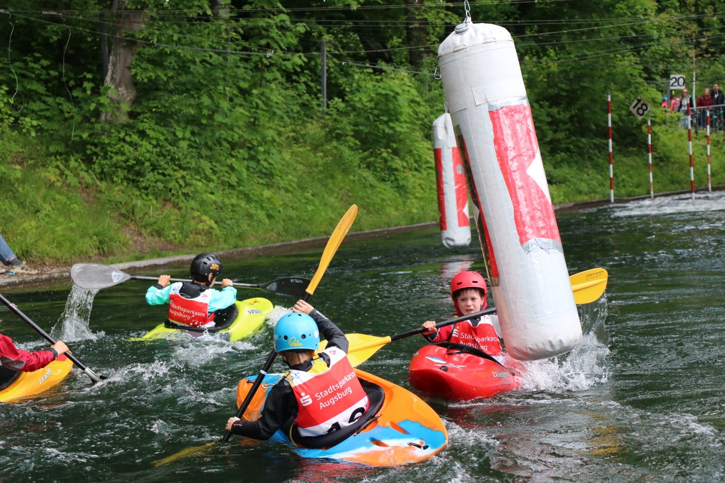 Pro Runde kamen die beiden Schnellsten weiter. Startgruppen und Startplätze wurden auch hier ausgelost. Gestartet wurde auf der Jugendstrecke (Start in der Abzweigung zum Olympiakanal, der wegen Wassermangels nicht geflutet war). Es standen vor allem der Spaß und Freude am Kajak Cross an erster Stelle. Man sah es den "Minis" an, dass sie mit Eifer und großer Begeisterung teilnahmen und den Hindernisparcour mit großer Ernsthaftigkeit befuhren. Zwei Läufe waren zu absolvieren, die Mama's und Papa's halfen ihren Jüngsten beim Bootstransport zurück zum Start jeweils mit.