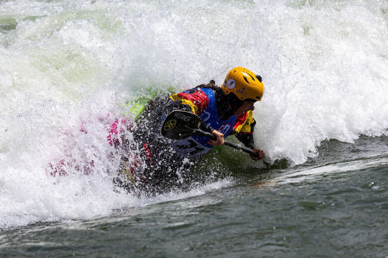 Weiter ging es im KO-System. Jeweils zwei Paddler fahren gegeneinander, wobei der Verlierer ausscheidet. In der ersten Final-Runde bewies Lucia Hacker Nervenstärke und setzte sich gegen Eoghan Kelly, den Weltmeister im Open Canoe durch. Der Gegner im Kampf um Platz eins war der Lokalmatador Jean-Yves Moustrou, welcher die Welle perfekt kannte. „Mir war eigentlich klar, dass ich mir gegen den Favoriten keine großen Hoffnungen zu machen brauchte. Trotzdem konnte ich mich mit einer persönlichen Bestleistung kurzzeitig auf Platz 1 vorkämpfen und damit Jean-Yves einen riesen Schrecken einjagen. Am Ende hat er aber doch verdient gewonnen und ich bin richtig zufrieden mit meinem 2. Platz.“.