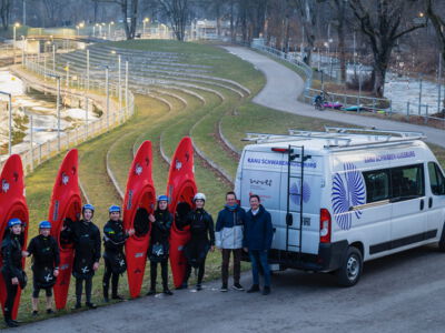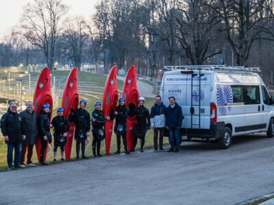 Zum Ende der Paddelsaison half die Stadtsparkasse dann ein zweites Mal, als es darum ging, dringend benötigte Kajakcross-Boote fürs Jugendtraining anzuschaffen. Diese wurden dann extra in England beim Weltmarktführer Pyranha als Sonderanfertigung bestellt – in Sparkassen-rot. Noch vor Sylvester geliefert, dauerte es keine Woche, bis der Schwabennachwuchs die Kajaks bei einer ersten Trainingseinheit nass gemacht hatte. Wobei aus Wasser schnell Eis wurde, denn die Temperaturen nach dem Jahreswechsel bekräftigten einmal mehr die alte und unbequeme Paddler-Weisheit: »Die Medaillen liegen im Schnee vergraben«. Und dank der Stadtsparkasse Augsburg war die Suche ein Leichtes.