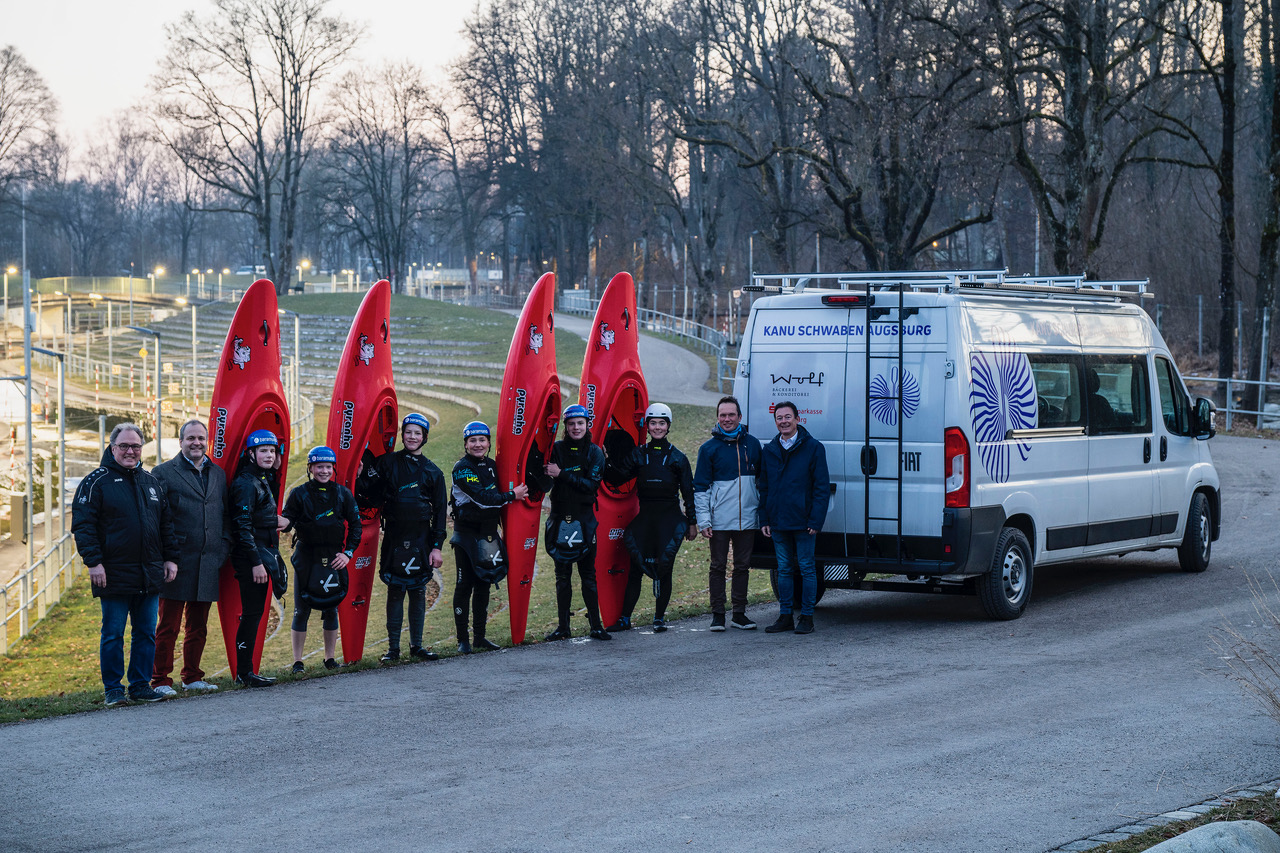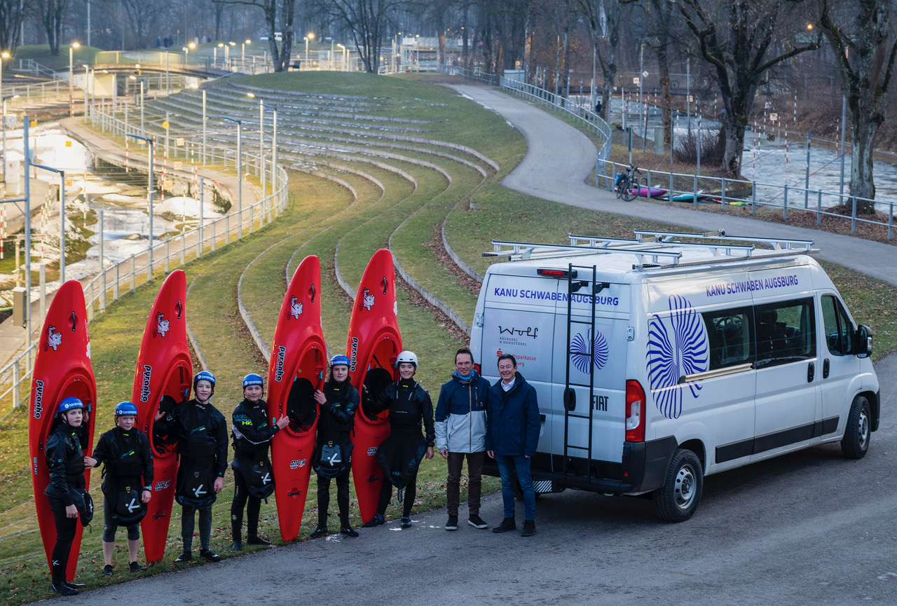Anfang letzten Jahres starteten die Kanuten zusammen mit der SSKA auf deren Spendenplattform mehrgeben.de einen Aufruf zur Finanzierung eines neuen Vereinsbusses. Das in Augsburg ansässige Kreditinsititut hat es sich dabei nicht nehmen lassen, den Spendentopf gleich mit einer »Anschubspende« gut zu füllen. Im Laufe der Wochen fanden sich viele weitere Klein- und Großspender, so dass Ende April ein passender Fiat Ducato, veredelt mit Einzelsitzen der Firma Schnierle, vor dem Bootshaus stand. Aber nicht lange, denn der bundesweite Wettkampfkalender war prall gefüllt. Mit einer Deutschen Meisterschaft, ausgetragen im tschechischen Roudnice, und drei Deutschland-Cups in Metz (Frankreich), Loder (Österreich) und Veltrusy (Tschechien) waren zudem viele zahlreiche Vignetten und Zusatzkilometer fällig.