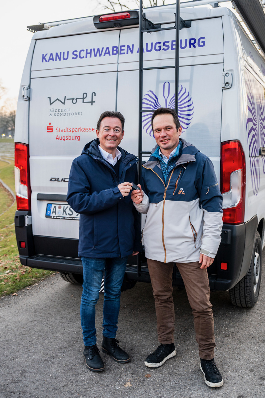 Anfang letzten Jahres starteten die Kanuten zusammen mit der SSKA auf deren Spendenplattform mehrgeben.de einen Aufruf zur Finanzierung eines neuen Vereinsbusses. Das in Augsburg ansässige Kreditinsititut hat es sich dabei nicht nehmen lassen, den Spendentopf gleich mit einer »Anschubspende« gut zu füllen. Im Laufe der Wochen fanden sich viele weitere Klein- und Großspender, so dass Ende April ein passender Fiat Ducato, veredelt mit Einzelsitzen der Firma Schnierle, vor dem Bootshaus stand. Aber nicht lange, denn der bundesweite Wettkampfkalender war prall gefüllt. Mit einer Deutschen Meisterschaft, ausgetragen im tschechischen Roudnice, und drei Deutschland-Cups in Metz (Frankreich), Loder (Österreich) und Veltrusy (Tschechien) waren zudem viele zahlreiche Vignetten und Zusatzkilometer fällig.